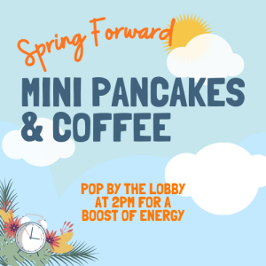 Spring Forward Event We will be serving Coffee and Mini Pancakes... 09 Mar 9:00 am - 2:00 pm Outside Between the Cafe and Parking Structure